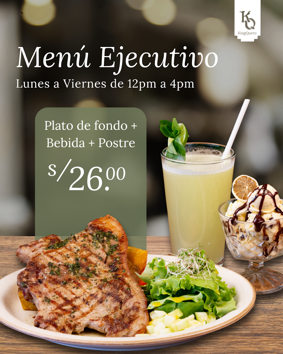The menu at Kingquero Restaurante Lounge Bar comes across as a confident showcase of Peruvian flavors interpreted with both tradition and creativity, leaving a strong final impression. Signature dishes like Arroz Con Pato and Ceviche de Pato highlight the restaurant’s ability to reinterpret classic ingredients with depth and balance, while premium cuts such as Tomahawk, Ozobuco, and Bife Ancho Con Linguinis la Pesto reinforce its focus on bold, satisfying mains. The seafood selection is equally compelling, with options like Ceviche Caliente, Parrilla Marinera, and Tallarin Al Pesto Con Milanesa de Corvina offering contrast between freshness and richness. Comfort and variety are well represented through plates such as Causa Rellena de Pollo, Causitas, and Papas Bravas, which work perfectly as starters or shared dishes. For those who enjoy hearty combinations, Parrillada Mixta and Tallarines Al Pesto Con Bistec deliver generous portions and familiar flavors done right. Pasta lovers will appreciate the range from Tallarines Alfredo to Tortellini 2 Quesos and Fetuccini A la Huancaína Con Lomo Saltado, each blending international techniques with local identity. Lighter yet flavorful choices like Filete de Pollo A la Plancha Con Chaufa de Quinoa and crowd-pleasers such as Alitas BBQ add further balance to the menu. To round out the experience, drinks like Limonada de Coco provide a refreshing counterpoint to the rich food offerings. Overall, the menu feels cohesive and well-curated, clearly designed to satisfy diverse tastes while staying true to a strong culinary personality.